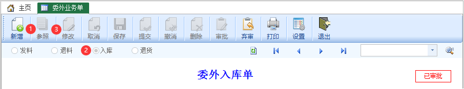 1、菜单路径:导航菜单进入“仓储管理\委外业务\委外业务单”。