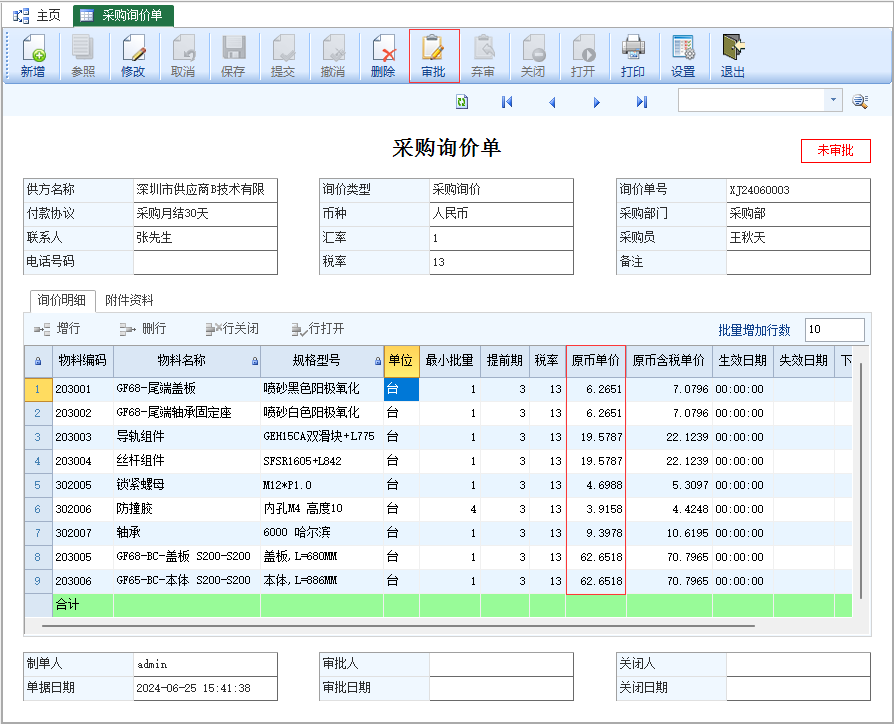 四、采购询价单询价完成后审批,询价同步到模拟报价单明细。